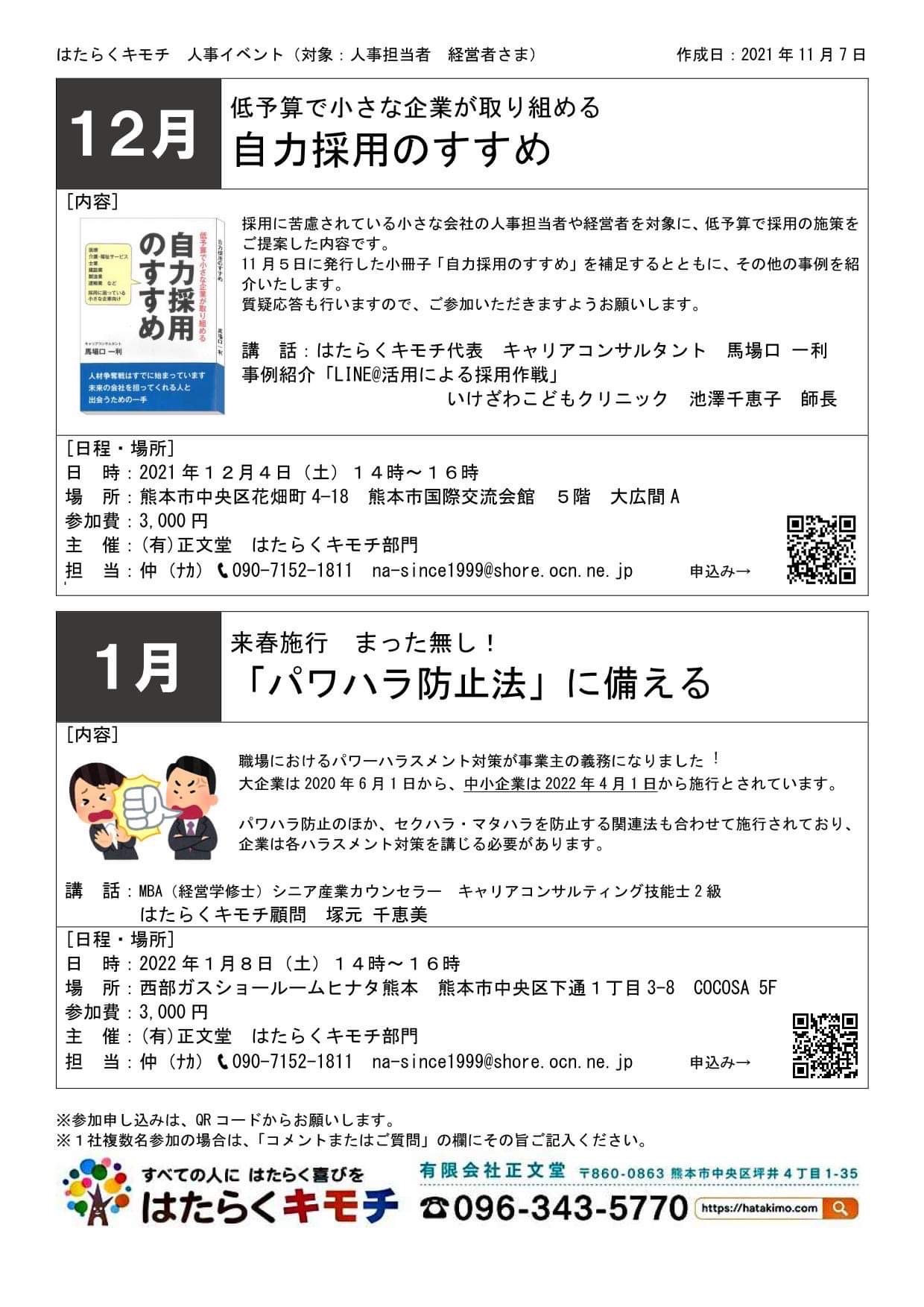 未分類 自力採用のすすめ Chieko.Official.Blog 2021年11月8日 はたらくキモチ代表 馬場口一利さん主催のイベントで講話をさせていただきます。 日程:2021年12月4日(土)14時~16時 場所:熊本市国際交流会館 5階 参加費:3000円 他、詳細は画像を御覧ください。 皆様とお会いできる事を楽しみにしています。 はたらくキモチ クリニック経営 人事 人事考課 小児科 看護師 講話